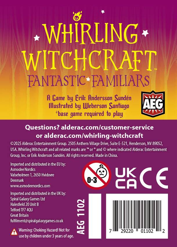 A Whirling Witchcraft: Fantastic Familiars egy könnyen tanulható kiegészítő a Whirling Witchcraft társasjátékhoz, 2 - 5 játékos részére, az átlagos játékidő rövid, csak 15 - 30 perc. A társast, a könnyebb tanulhatósága ellenére, csak 10 éves kortól ajánljuk kipróbálni. A játékmenet erősen épít a váltakozó képességek és az egyidejű akciók mechanizmusokra.