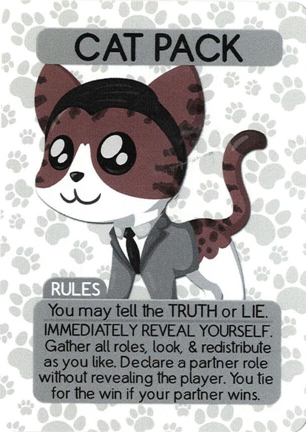 An Oceans 11 inspired Wild Cats card, the Cat Pack, that allows a player to look at and redistribute the roles as they'd like, delivered in Board Game of the Month Club April 2016 package. This new character stops the game right after it starts, takes all of the cards and distributes them as he/she pleases. Then picks a role to align with. It's fun heady...