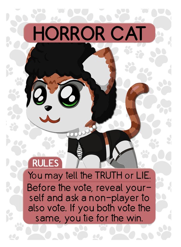 A new character for Wild Cats, Horror Cat, inspired in Dr. Frank-N-Furter from The Rocky Horror Picture Show, and delivered in Board Game of the Month Club July 2016 package. Sticking with audience participation, Horror Cat involves a non-player. Yes, you need to find someone who is not in the game and get them to vote along with you to tie for the win....