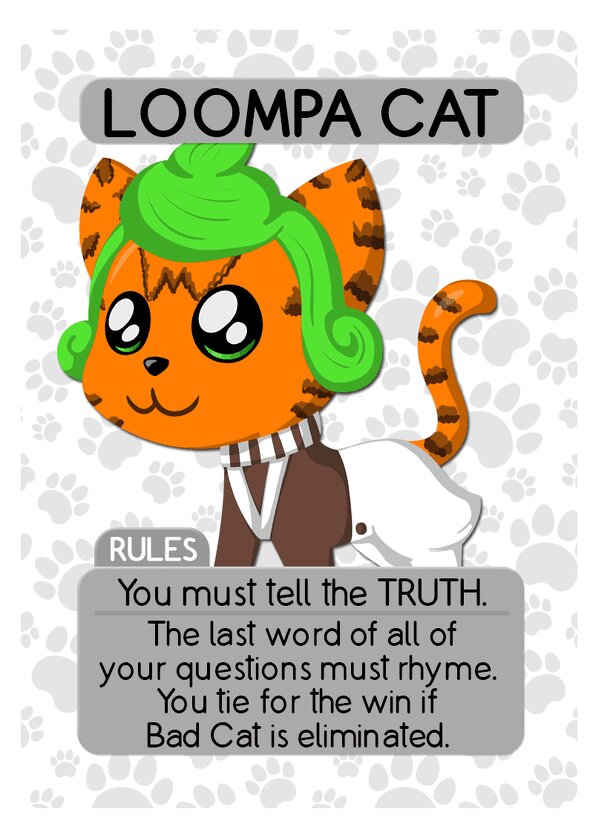A Wonka inspired Wild Cats card, the Loompa Cat that forces a player to rhyme and get rid of any bad eggs, delivered in Board Game of the Month Club May 2016 package. In the spirit of the film, with the Loompa Cat you need to ask questions in rhymes and you want the bad egg, I mean cat, out of the game. If you are too obvious, the bad cat might turn things...