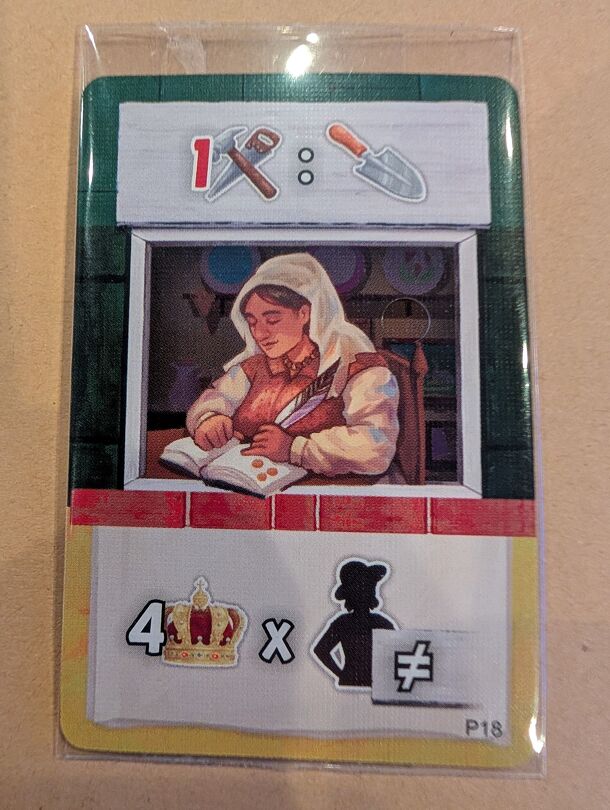 Promo card (marked P18) that was first made available for the backers of the Kickstarter-campaign of Board&Dice Accessories. It's an extra helper/contract card with the following abilities: -Helper: When you spend a Tool during your turn, you may also Plant 1 Tulip Bulb. - Contract: Receive 4 Victory Points for each different Helper trigger you have...