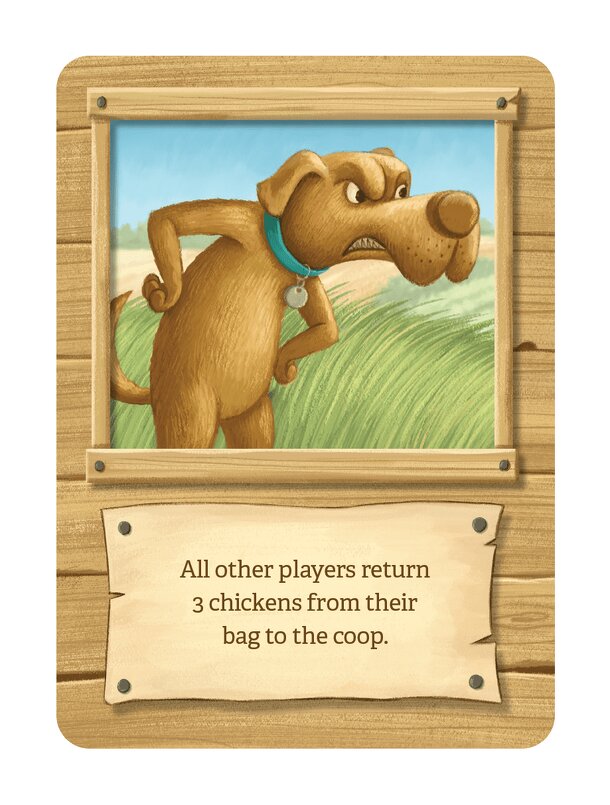 When played, all other players must return 3 chickens from their bag to the coop. If they don't have 3 chickens, they must return all that they do have in their bag. This does not impact cooked chickens.