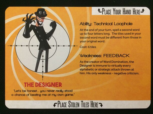 Word Domination role promo card given away at Gen Con 2017. "Let's be honest...you never really stood a chance of beating me at my own game." Ability: Technical Loophole At the end of your turn, spell a second world up to four letters long. The tiles used in your second word must be different from those in your original word. Cost: 6 tiles Weakness:...