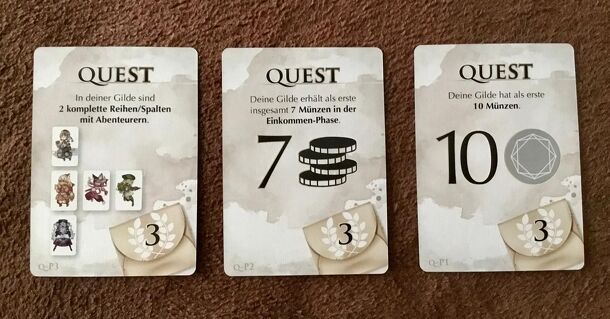 3 additional Quest promo cards Q-P1 Your guild is the first to collect ten coins. ("Deine Gilde hat als erste 10 Münzen.") Q-P2 Your guild is the first to gain a total of seven coins in the income phase. ("Deine Gilde erhält als erste insgesamt 7 Münzen in der Einkommen-Phase.") Q-P3 In your guild, two rows or columns with adventures have been completed....