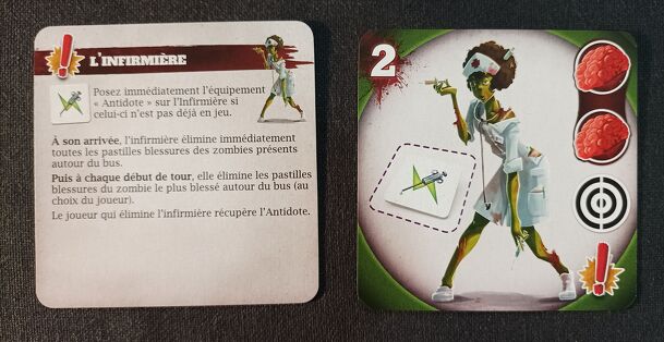 Immediately place the "Antidote" equipment on the nurse if it is not already in play. On her arrival, the nurse immediately removes all the zombie wounds present around the bus. Then at the start of each turn, she eliminates the wounds of the most injured zombie around the bus (player's choice). The player who eliminates the nurse gets the Antidote. Posez...