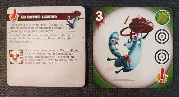 Upon arrival, the raccoon immediately loses an item of equipment for each player who owns it (of your choice). Then at the start of each turn, and as long as it remains in play, he eliminates a random token from the equipment pile. Note: if both the raccoon and the squirrel are in play, the raccoon immediately joins the squirrel on the active player! It...